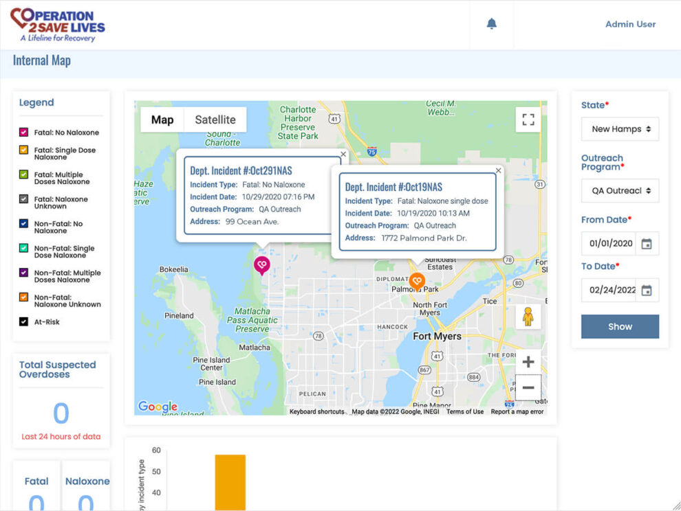 The O2SL data platform, developed using .Net Core and SQL, brings stakeholders (such as public safety, public health, and community leaders) together to address America’s substance abuse crisis effectively. Unprecedented frontend incident data is now available to programs across the country. They can easily track incident information and overdose incidents that can be shared with partners in real time.